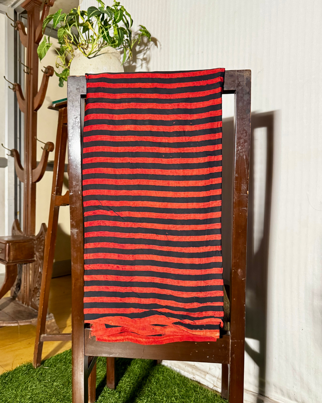 Premium Gajji silk with hand-blocked Ajrakh patterns in dark red and black. Unstitched for a custom fit, blending heritage craft with luxurious appeal.