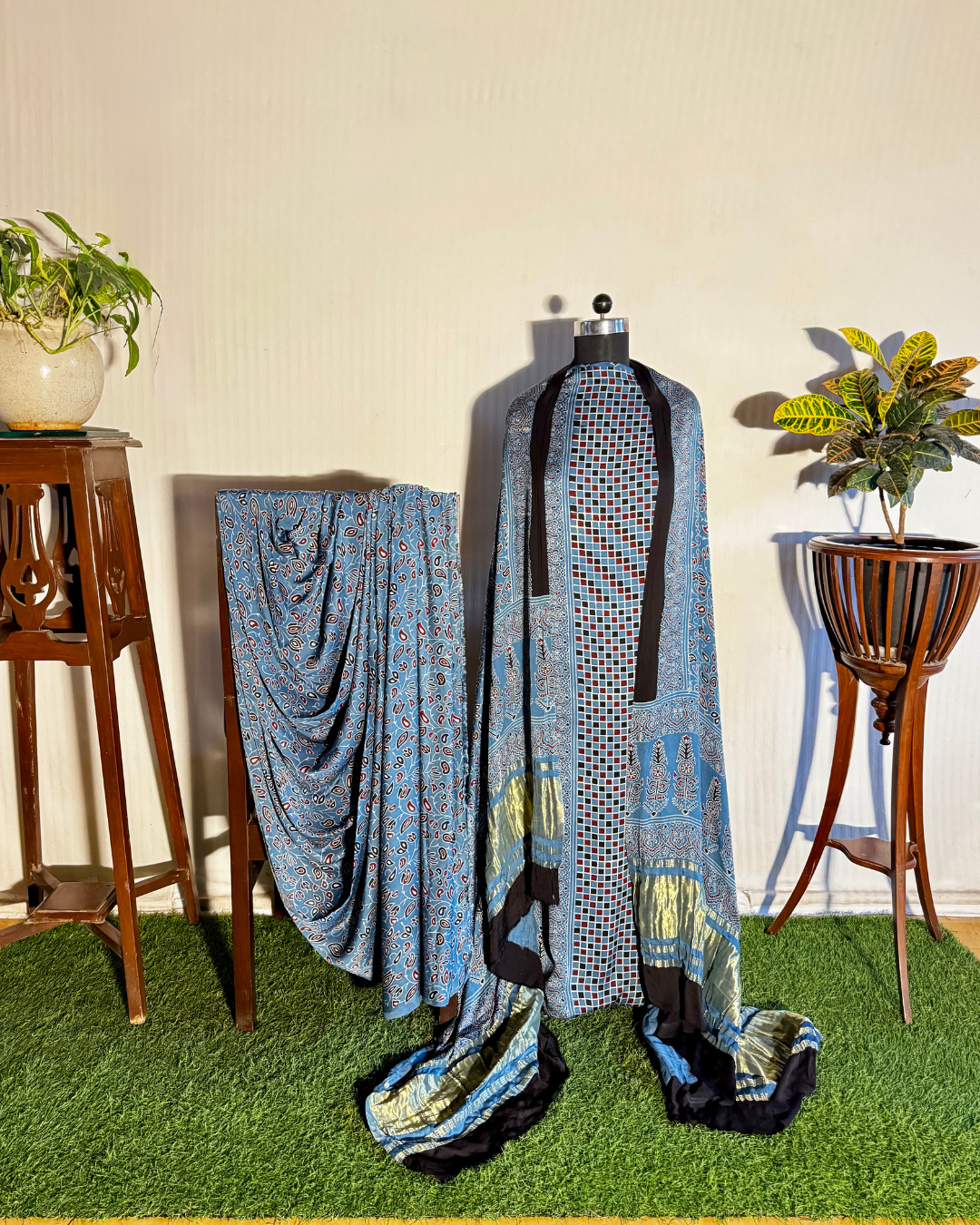 Blue Ajrakh Unstitched Gajji Silk Dress Material Set with Lagdi Patti Dupatta